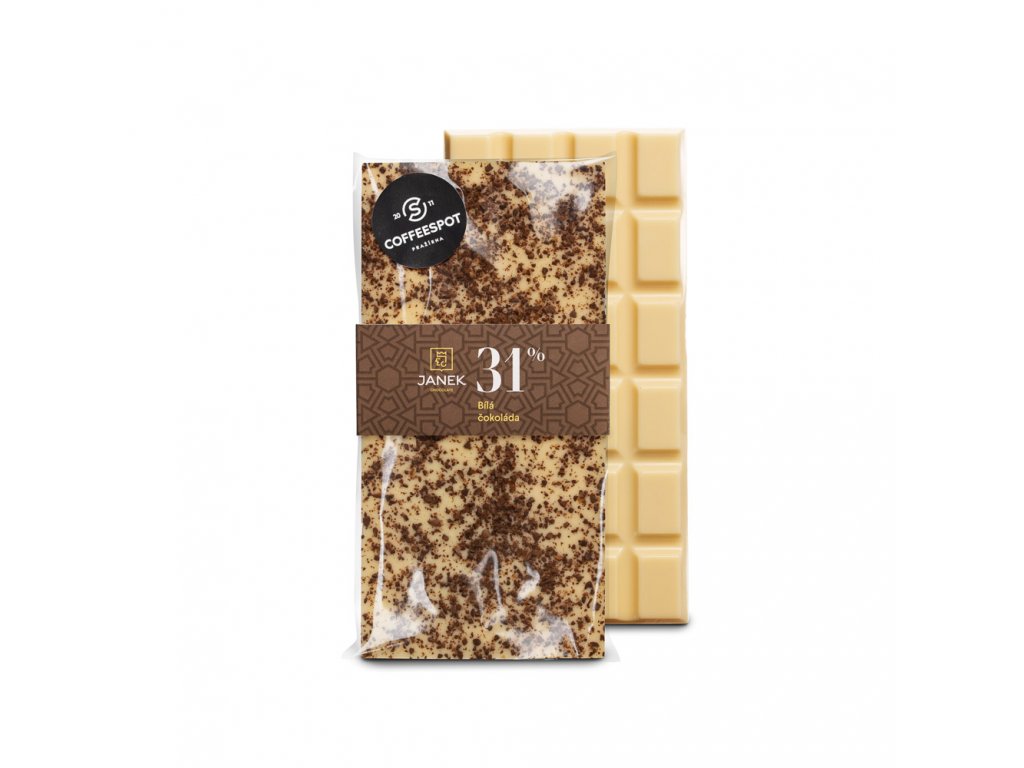 Sladká bílá čokoláda provoněná vanilkou. Žádnými aromaty nebo esencemi. Ale zrníčky pravé vanilky. K tomu přidejte pár nadrcených zrn kávy Ethiopia Limu Gr.2 a máte tabulku, která voní, křupe a zároveň se pomalu rozplyne na jazyku.