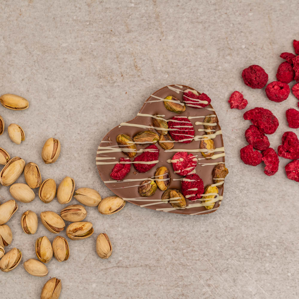 Mléčná čokoláda zdobená malinami, pistáciemi a bílou čokoládou. Harmonické spojení chutí, které potěší oko i chuťové buňky a udělá z každého okamžiku malý svátek.