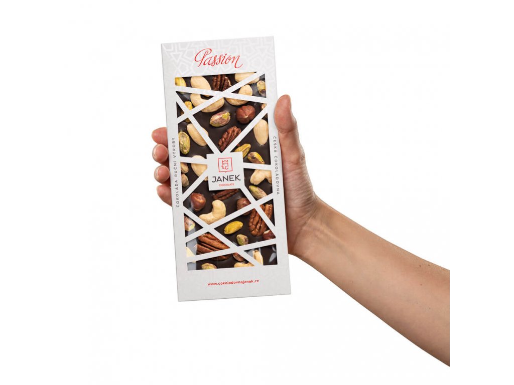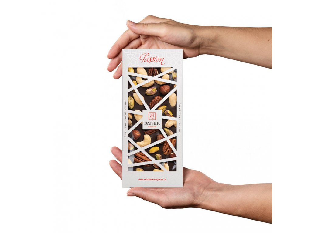 Passion – to jsou čokolády, které mají víc procent a taky chutí. Hráli jsme si, kombinovali. Všechny suroviny ladí a chuť pořádné hořké čokolády maximálně zvýrazňují. A v tomhle případě je to hrst těch nejkvalitnějších ořechů. I když jsme ji tvořili v zápalu a s vášní, vznikla z toho tabulka harmonie.
