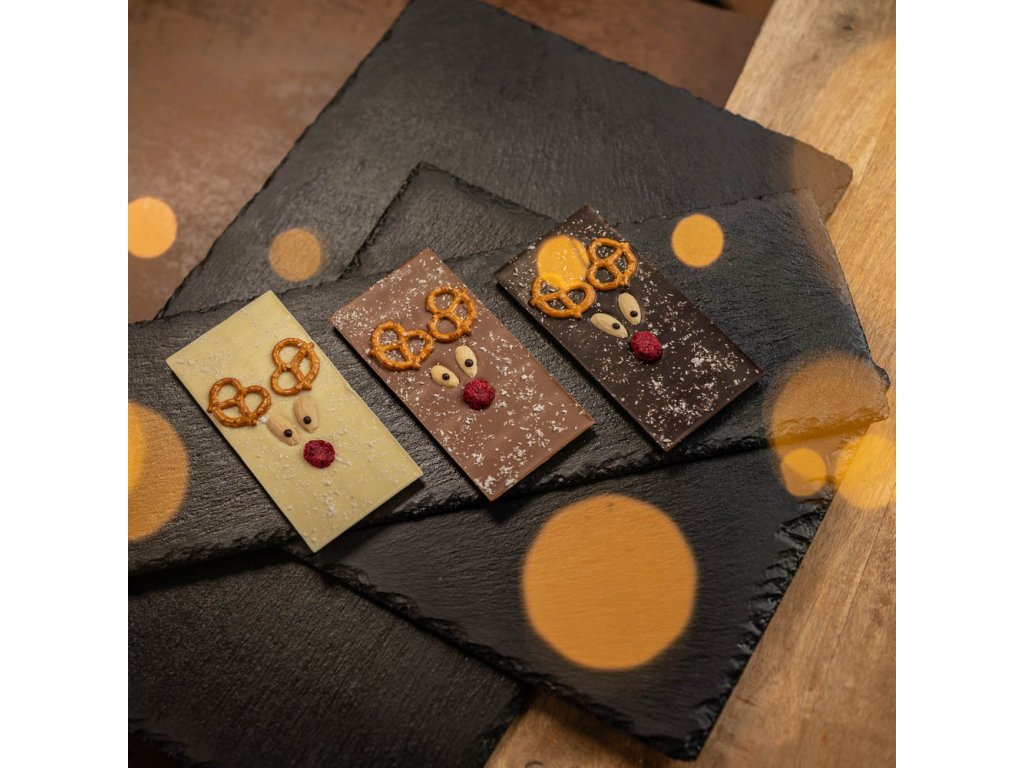 Lahodná tmavá, mléčná nebo bílá tabulka originálně zdobena. Tabulka se slanými preclíky, mandlemi, lyofilizovanou malinou a celou zasypanou kokosem ve tvaru sobíka.