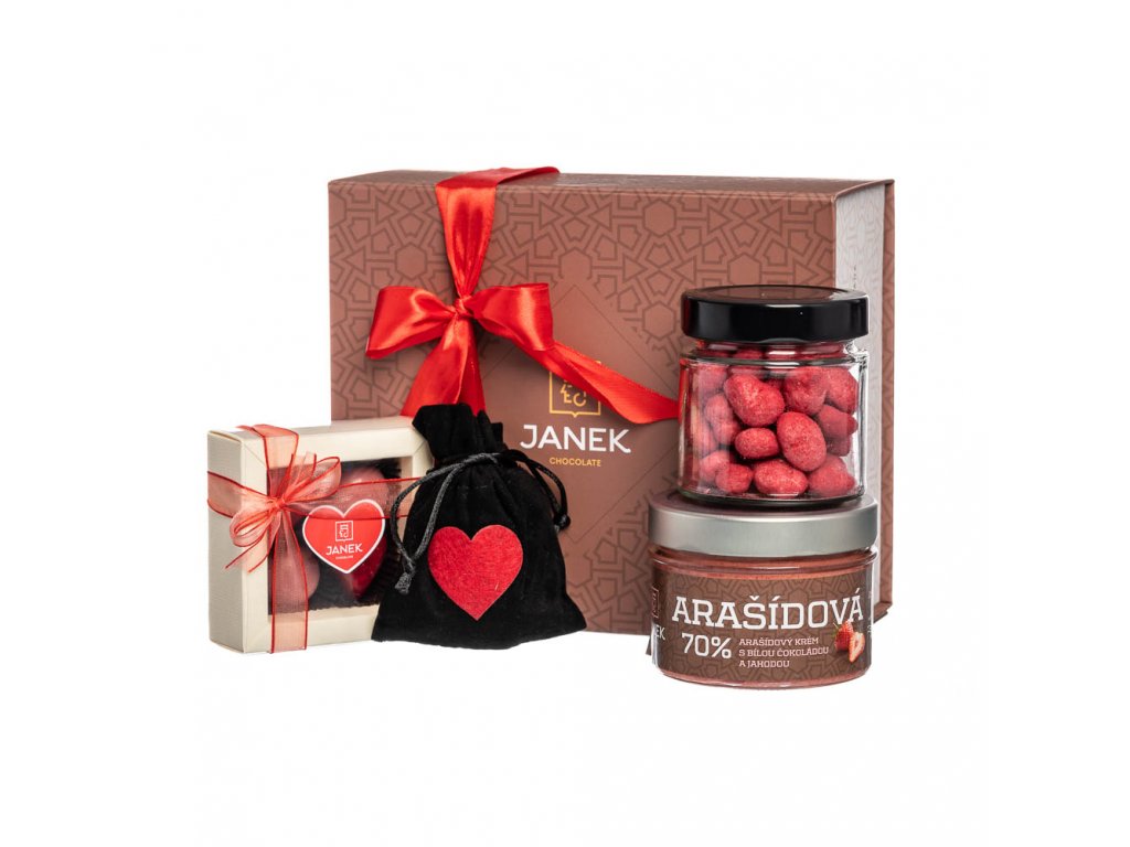 Čokoládové dukáty | Arašídový krém s bílou čokoládou a jahodou | Krabička s pralinkami 4ks | Obalené mandle | |