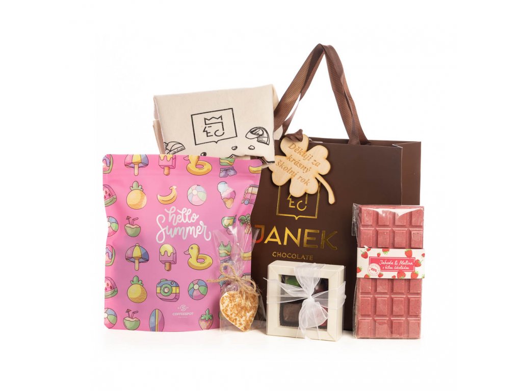Na dárkové tašce najde dřevěný čtyřlístek s vygravírovaným vzkazem „Děkuji, za krásný školní rok“. Ale ještě lepší je to, co objeví uvnitř.