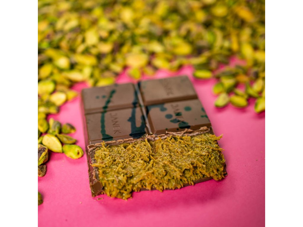 Složení: Mléčná čokoláda (kakaová hmota 34%, kakaové máslo, sušené mléko, cukr, sójový lecitin, přírodní vanilka), pistáciová pasta, knafeh (pšeničná mouka, pšeničný škrob, sůl, sójový lecitin, slunečnicový olej, sorban draselný, voda), přepuštěné máslo, tahini, barvivo (e100, e163, e141).