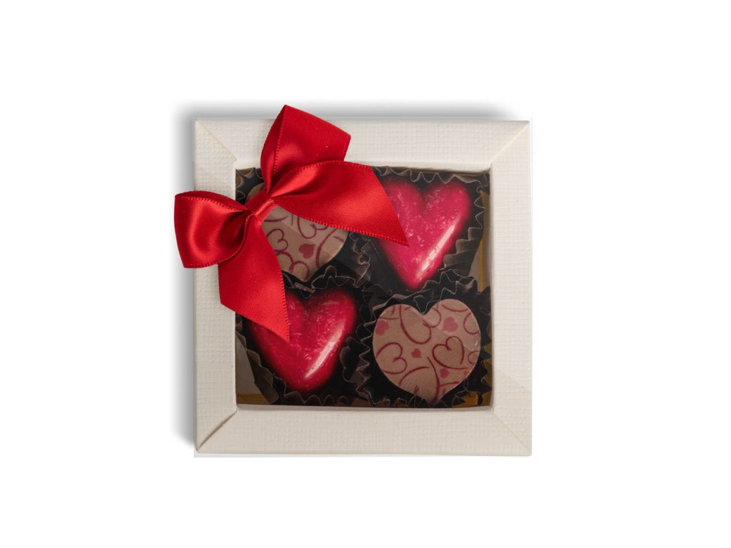 - 4 lahodné pralinky ve tvaru srdíček, pečlivě vyrobené z prvotřídní čokolády.