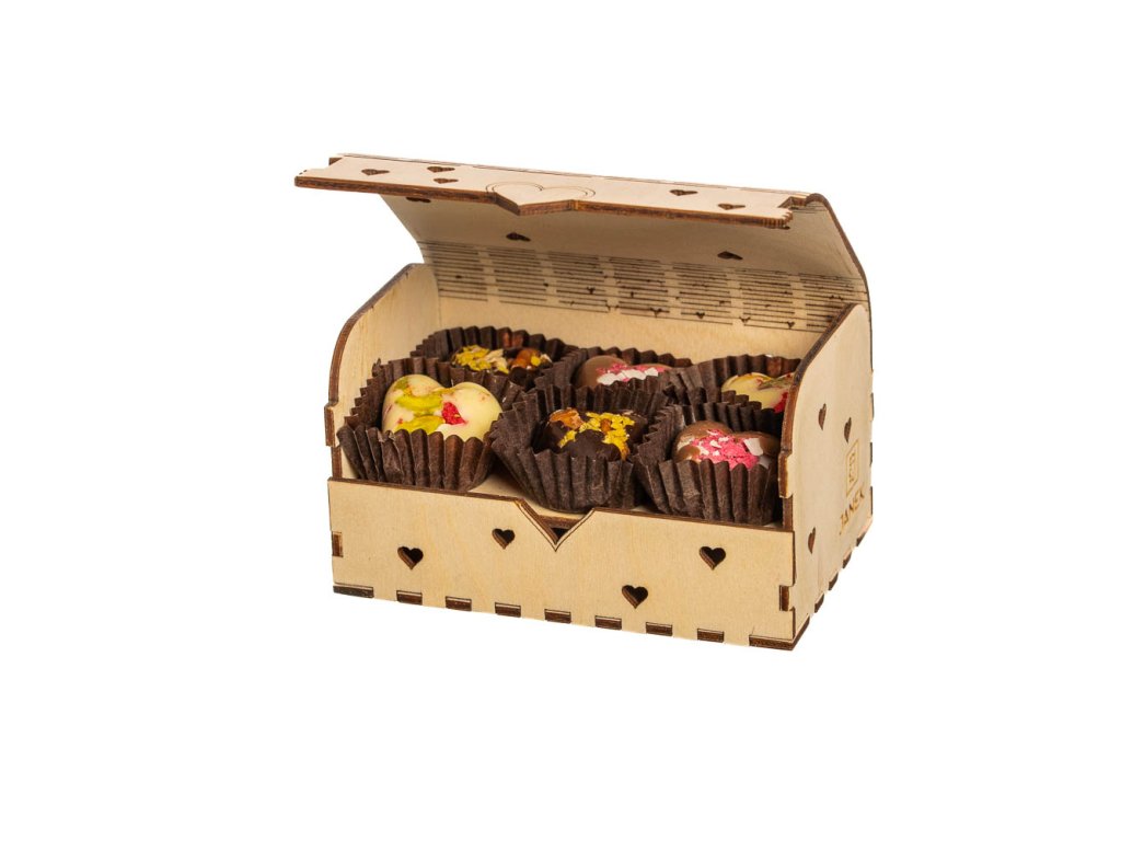 Znáte ten nejtajemnější poklad ? Ten náš jsme uložili do dřevěné truhly. Lahodné spojení čokoládových jednohubek a krásná dřevěná truhlička s nápisem "miluji tě" na památku.