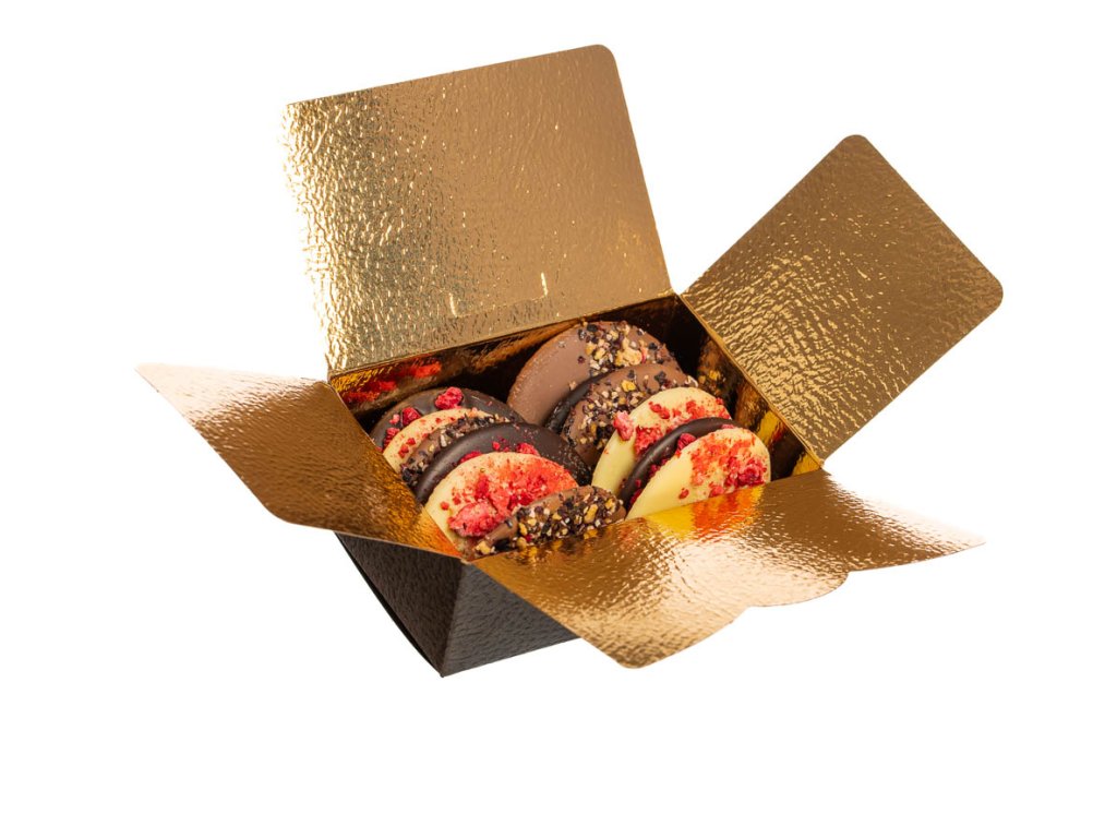 Čokoládové placky s lyofilizovaným ovocem a oříšky. V krabičce naleznete 12 koleček - 4x tmavá čokoláda, 4x mléčná čokoláda, 4x bílá čokoláda.