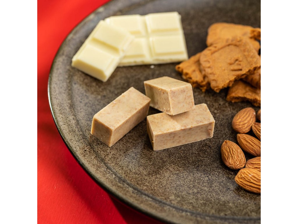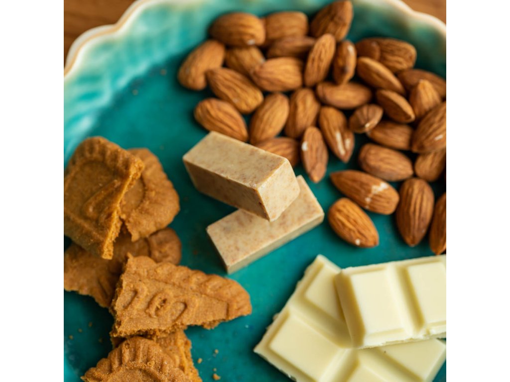 Složení: Mandle (rozmělněné), lotus, bílá čokoláda, (kakaové máslo, sušené plnotučné mléko, cukr, emulgátor: sójový lecitin, aroma: přírodní vanilka)
