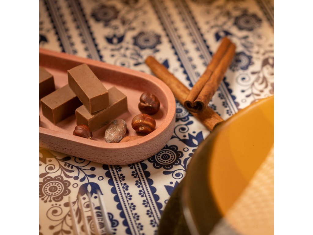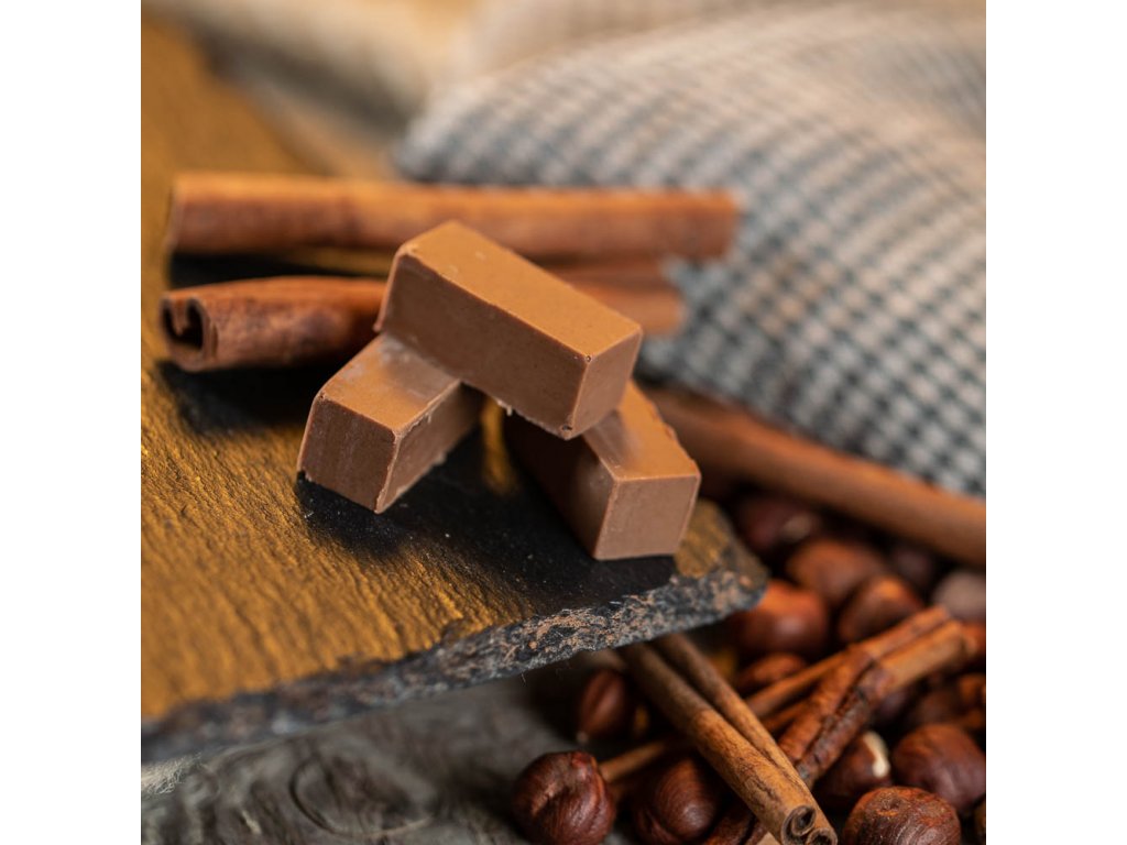 Složení: Lískový ořech 40 % (rozmělněné), mléčná čokoláda, (kakaová hmota (34 %), kakaové máslo, sušené mléko, cukr, emulgátor: sójový lecitin, aroma: přírodní vanilka), skořice.