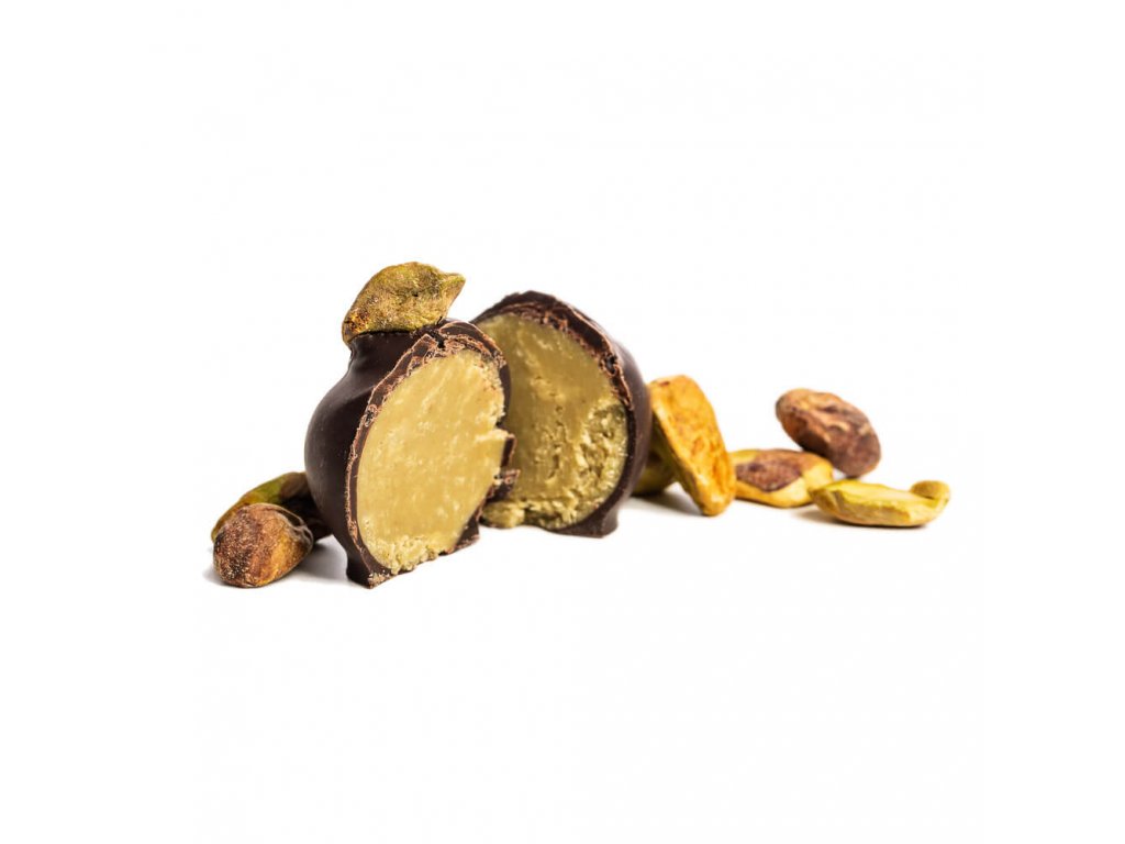 Složení: bílá čokoláda, mléčná čokoláda, hořká čokoláda (kakaová hmota, kakaové máslo, cukr, sušené mléko, přírodní vanilka, sójový lecitin) smetana, pistáciová pasta (15,5%).