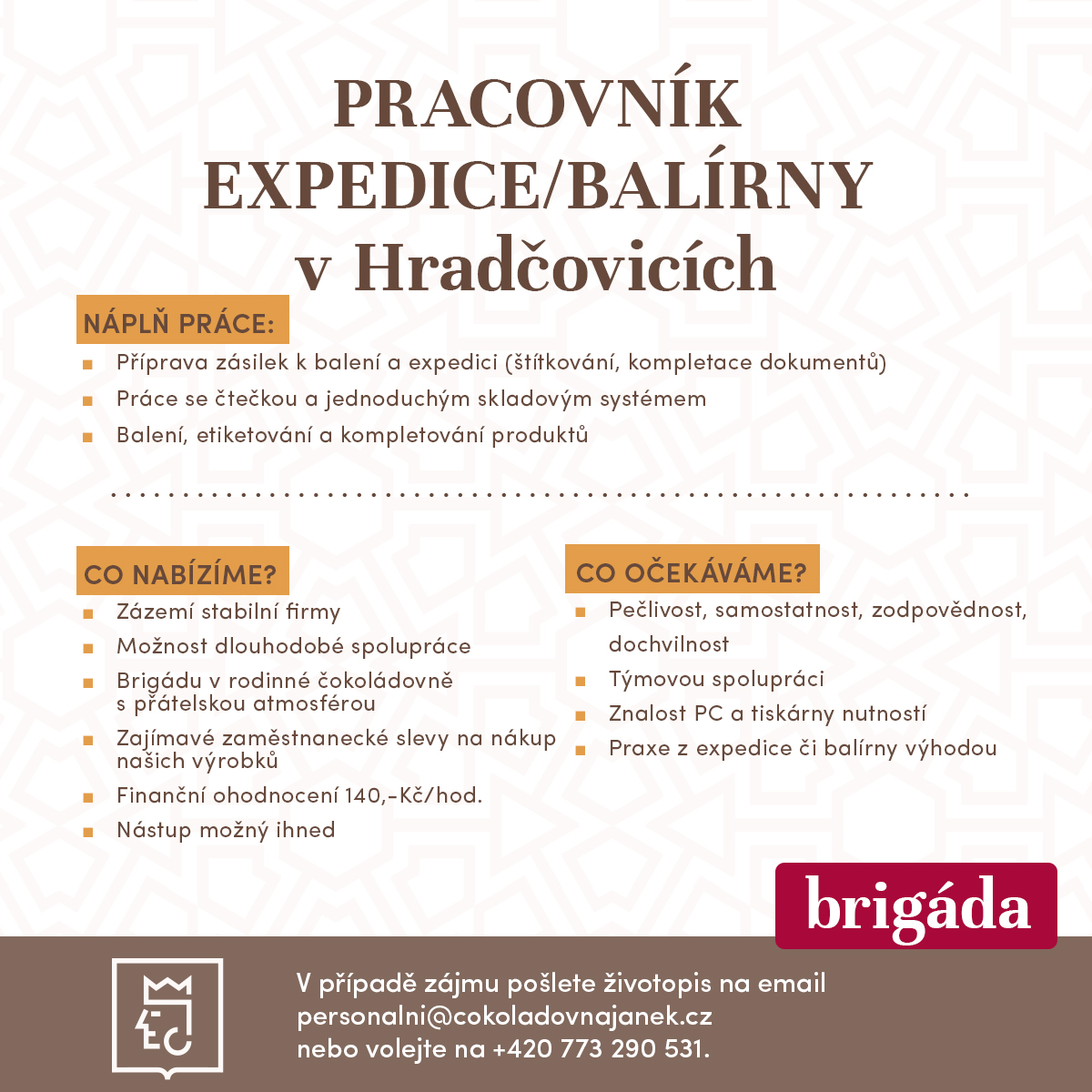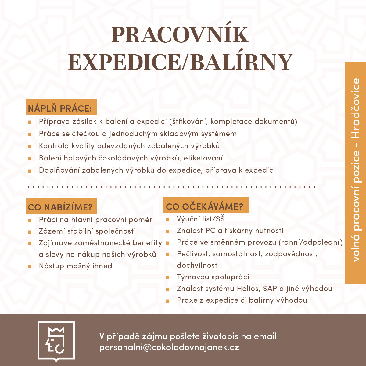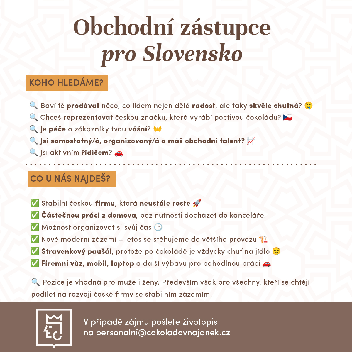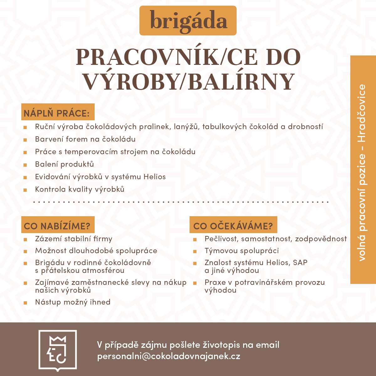 Chceš být součástí našeho týmu? Vyplň formulář nebo nám napiš na personalni@cokoladovnajanek.cz – možná hledáme právě tebe! Nezapomeň přiložit životopis a pro obchodní pozice i motivační dopis.