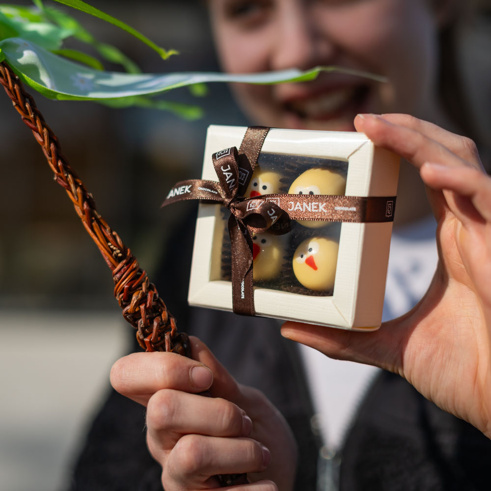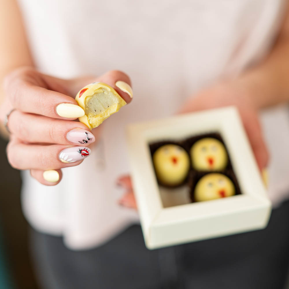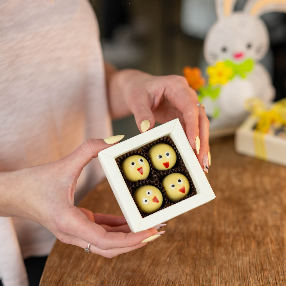 Velikonoce jsou plné zajíčků, vajíček… a občas se mezi nimi objeví i jedno malé kuřátko. A přesně takové jsme schovali na naši velikonoční krabičku. Uvnitř ale nepípá – místo toho tam čekají čtyři poctivé pralinky z naší čokolády, které udělají radost každému mlsounovi. Malý dárek, který dokáže vykouzlit velký úsměv.