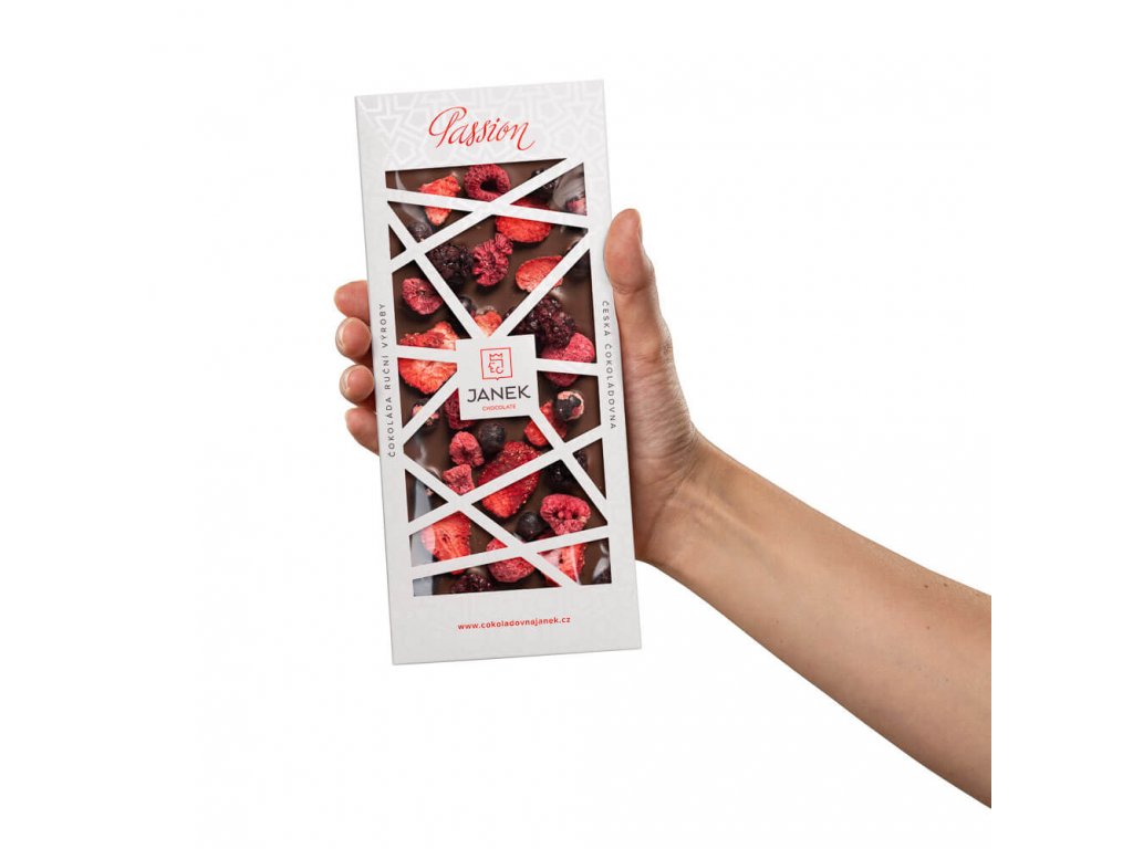 Passion – to jsou čokolády, které mají víc procent a taky chutí. Hráli jsme si, kombinovali. Všechny suroviny ladí a chuť jemné mléčné čokolády maximálně zvýrazňují. Maliny, jahody, ostružiny a rybíz. I když jsme ji tvořili v zápalu a s vášní, vznikla z toho tabulka harmonie.