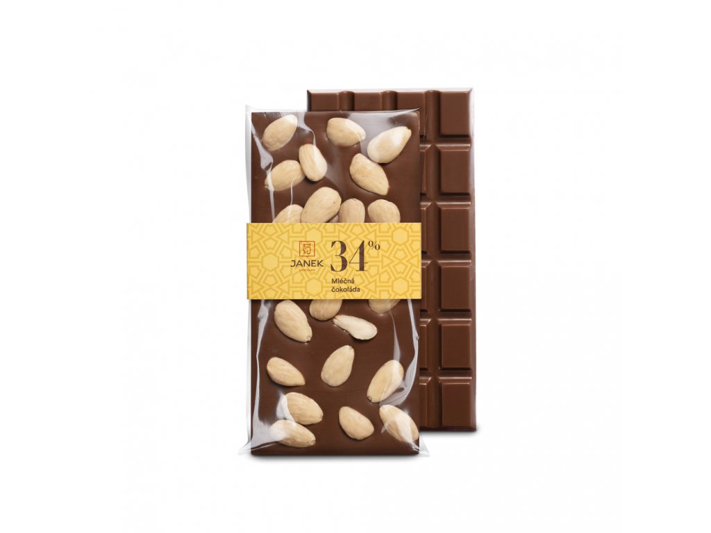 Ingredience: kakaová hmota 34 %, kakaové máslo, sušené mléko, mandle (20%), cukr, emulgátor: sójový lecitin, aroma: přírodní vanilka.