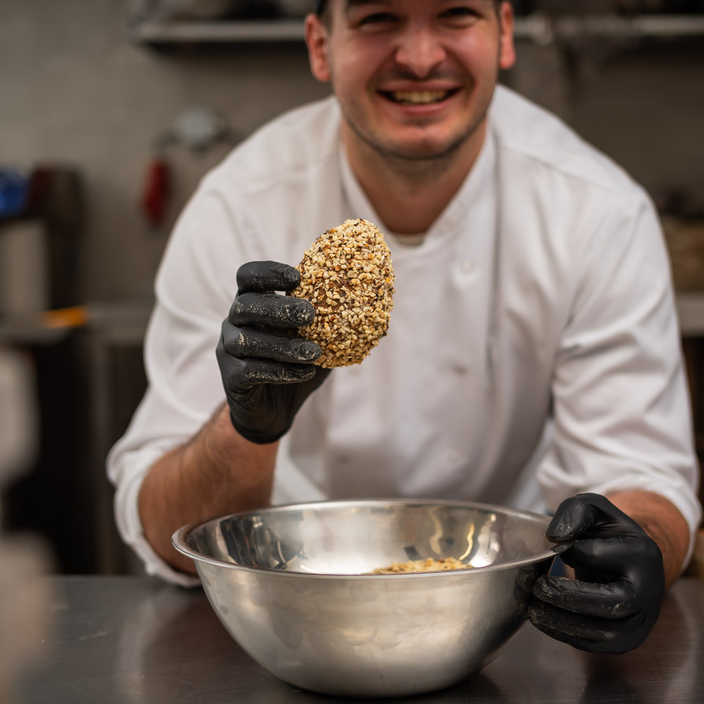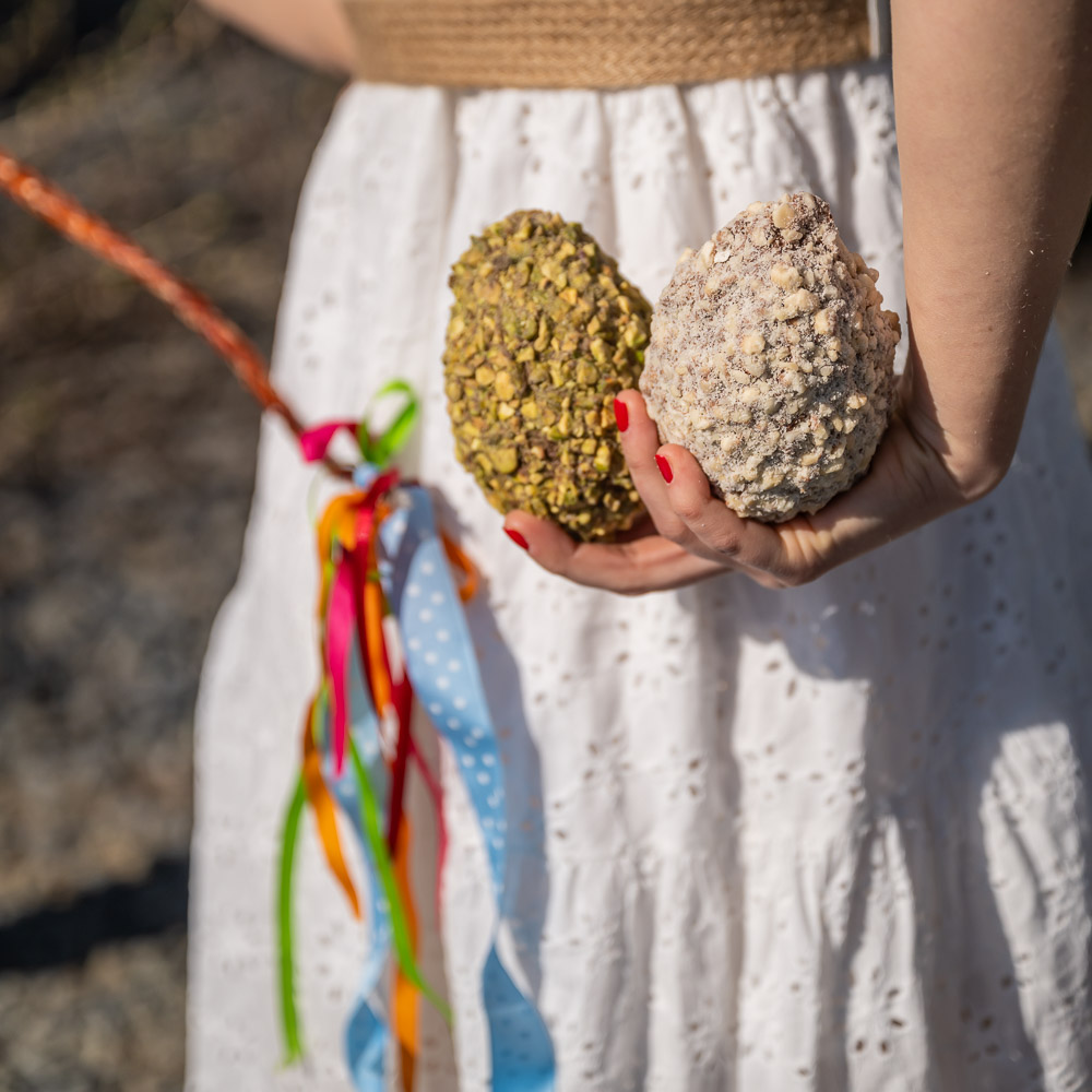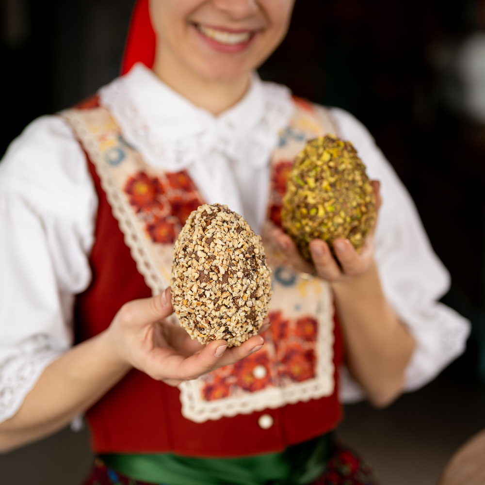 Poté obě poloviny spojíme dohromady a necháme vše důkladně zafixovat. Následuje finální krok, který dodává vajíčku jeho charakter – obalení v nasekaných lískových oříšcích. Oříšky jemně přitlačíme k povrchu, aby pevně držely a zároveň vytvořily bohatou, křupavou vrstvu, která krásně doplňuje jemnost nugátové náplně.