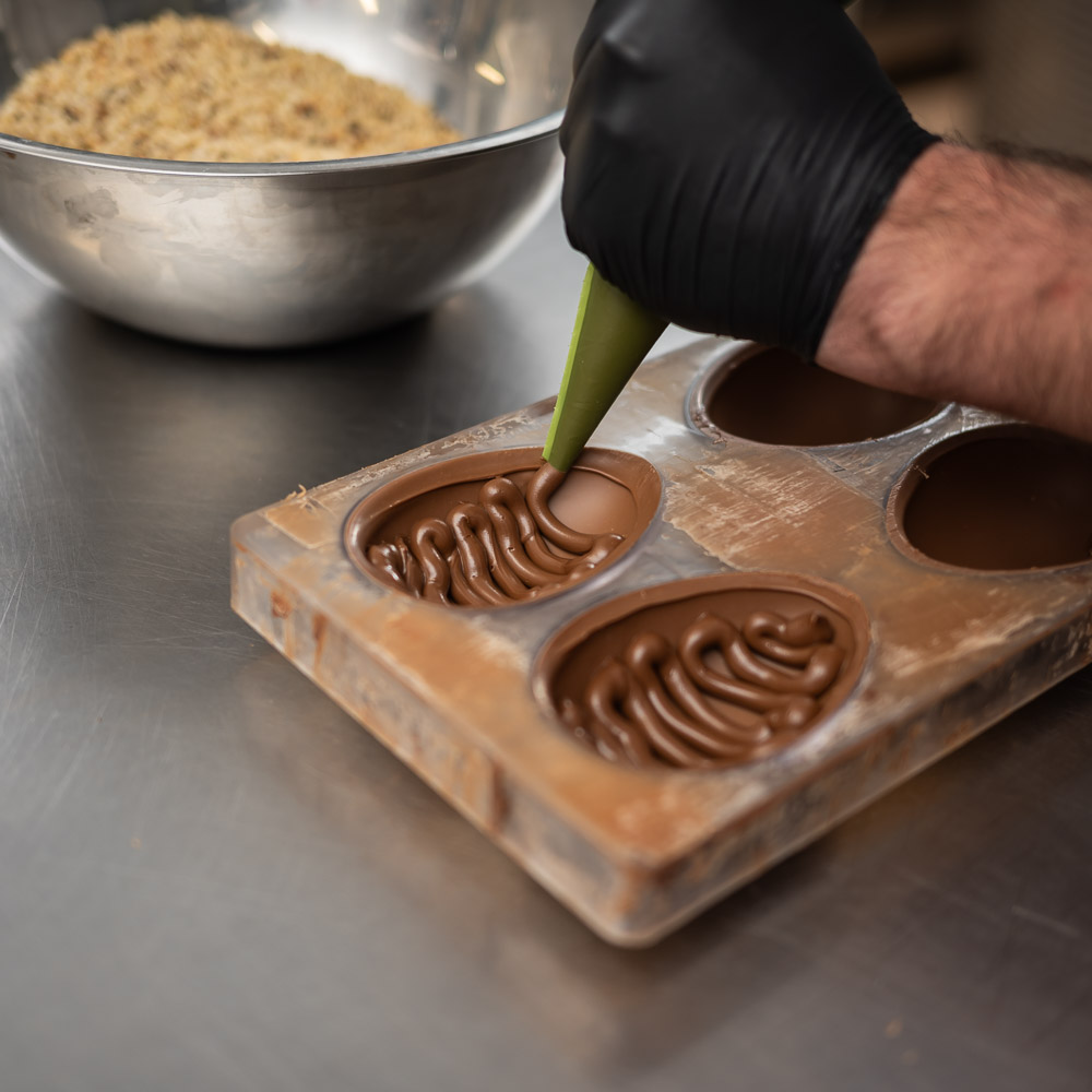 Jakmile čokoláda ztuhne, přijde na řadu náplň. V tomto případě plníme vajíčko lahodným lískooříškovým nugátem – jemným, krémovým a krásně vláčným. Nugát pečlivě dávkujeme tak, aby byl každý kus po rozkrojení dokonale vyvážený – dostatek náplně, ale stále s příjemně silnou vrstvou čokolády kolem.