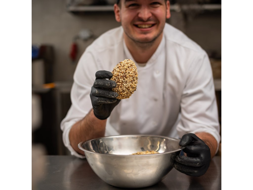 Poté obě poloviny spojíme dohromady a necháme vše důkladně zafixovat. Následuje finální krok, který dodává vajíčku jeho charakter – obalení v nasekaných lískových oříšcích. Oříšky jemně přitlačíme k povrchu, aby pevně držely a zároveň vytvořily bohatou, křupavou vrstvu, která krásně doplňuje jemnost nugátové náplně.