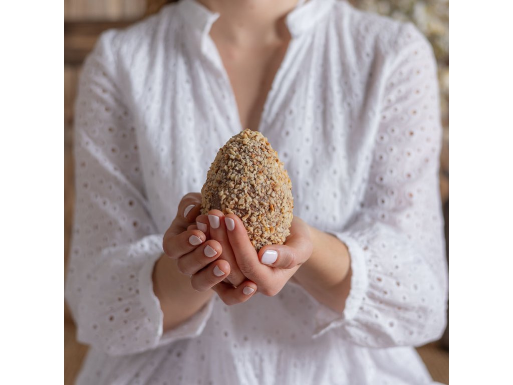 Mléčné vajíčko plněné nugátem obalené v lískovém ořechu